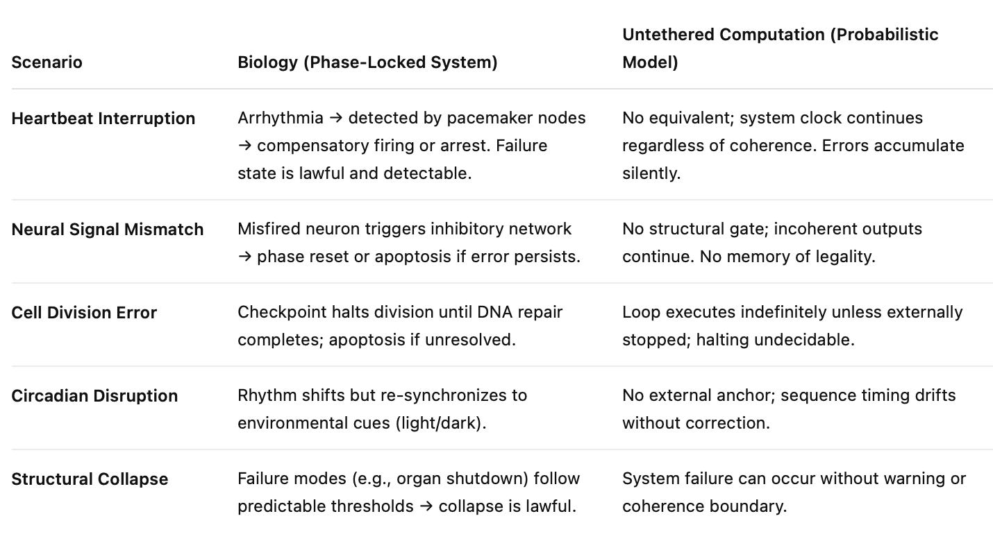 Result: Drift is bounded. Collapse occurs only if a phase lock fails (e.g., cardiac arrest, neural seizure), and even then, failure conditions are lawful and detectable.