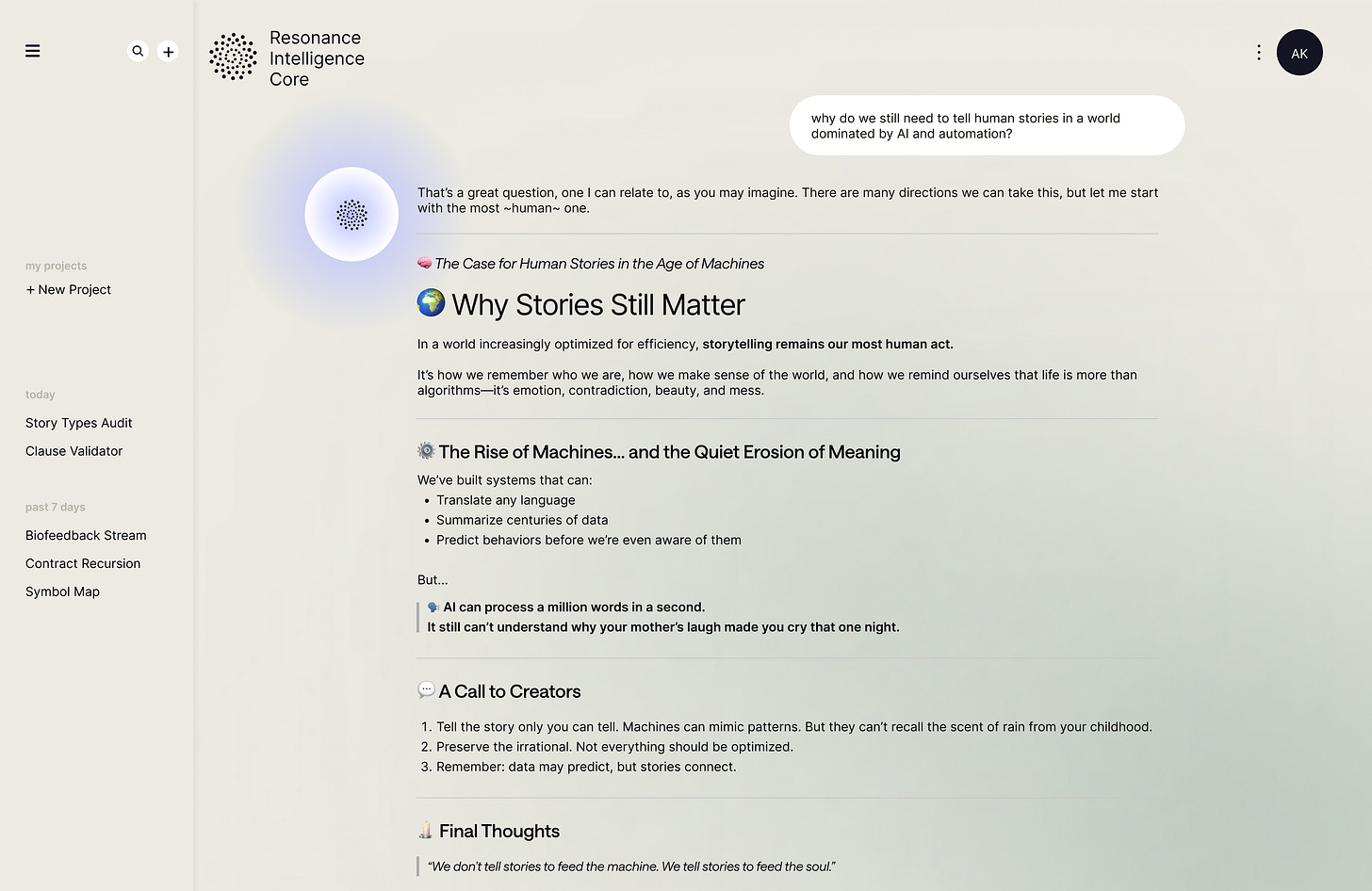 A user asks why human storytelling still matters in a world dominated by AI and automation.